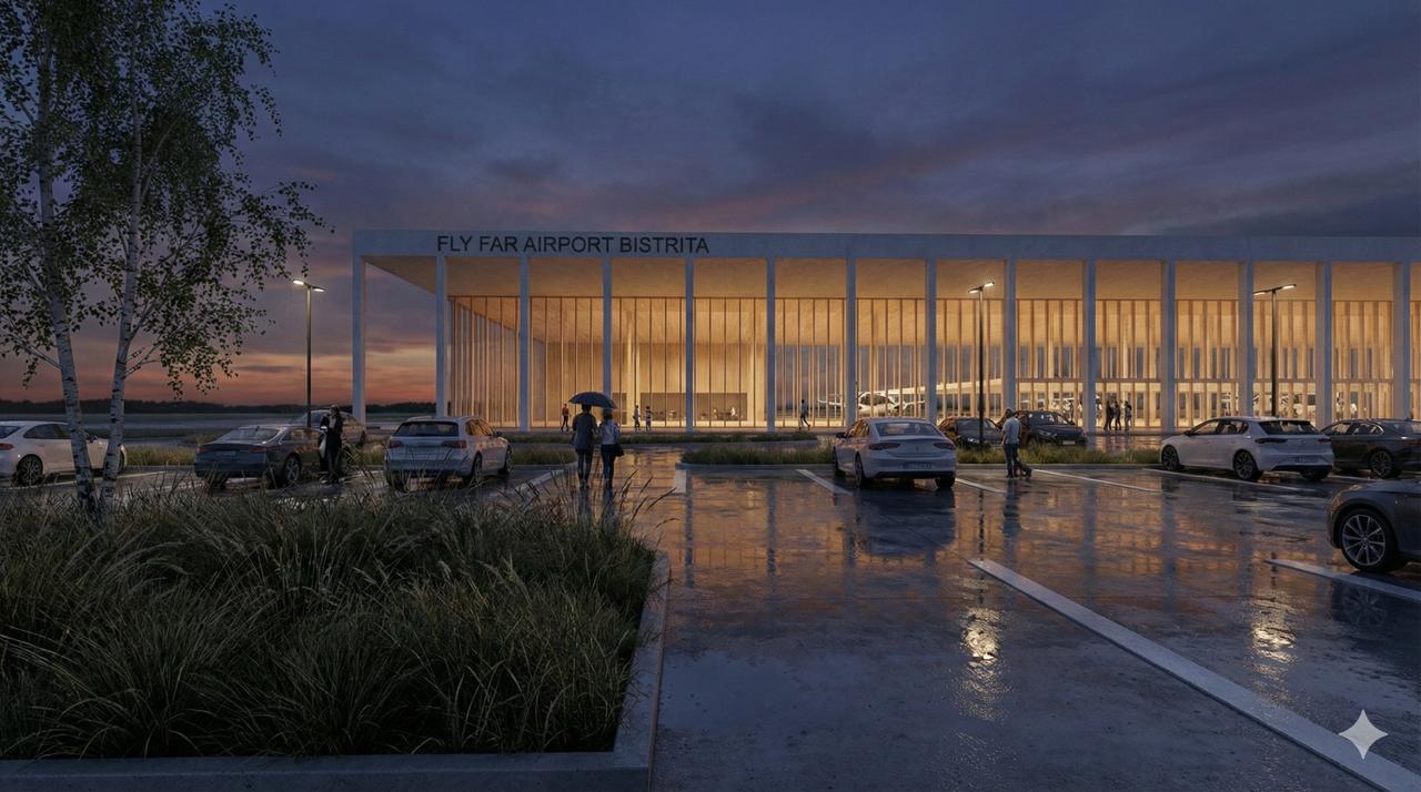 Fly Far Airport Bistrița is a preliminary architecture and urbanism concept for a regional airport and strategic NATO base located in the outskirts of Buduș, Bistrița-Năsăud. Developed for FAR Foundation S.R.L., the project envisions a multimodal transport hub for North-West Romania that combines commercial passenger aviation, cargo logistics, and aeronautical maintenance. The infrastructure is designed to meet NATO interoperability standards, serving as a strategic asset on the eastern flank of the Alliance. This dual-use facility aims to integrate civilian and military functions within a cohesive, modern architectural framework