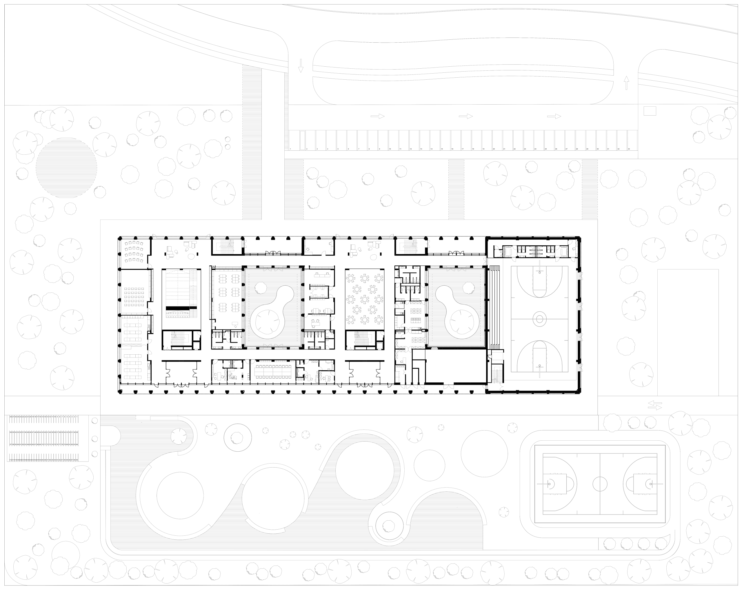 Our interior design reflects a high level of architectural complexity, tailored to support a comprehensive and interactive educational approach. We integrated bright indoor spaces for socializing and relaxation, including a spacious ground-floor amphitheater and a dedicated dining hall. To accommodate a wide range of extracurricular activities, the program features arts and crafts and carpentry workshops, a music room, a theater club, and spaces dedicated to student projects. The science curriculum is supported by specialized biology, chemistry, and physics laboratories, alongside a dedicated robotics and programming room. Finally, we prioritized physical education by designing an indoor sports hall complemented by outdoor sports and recreation areas
