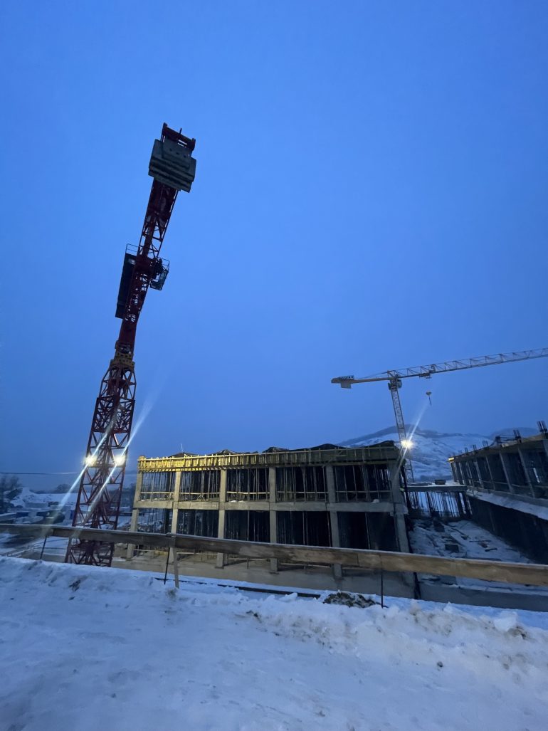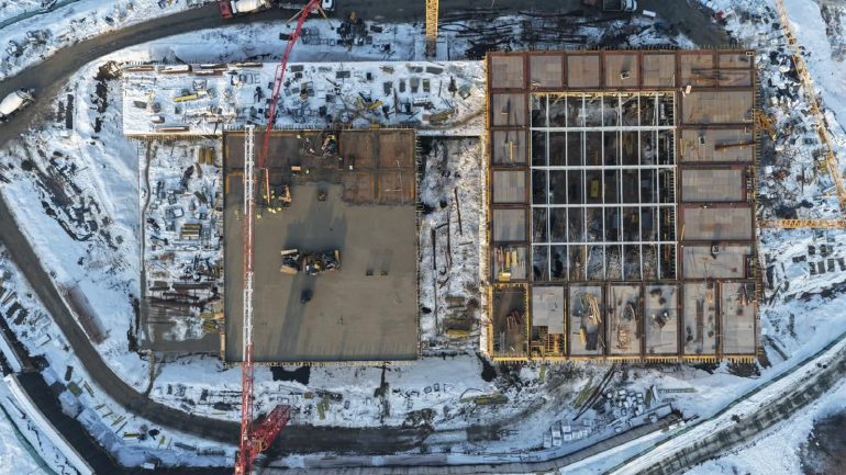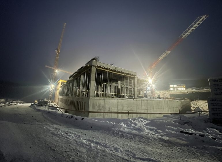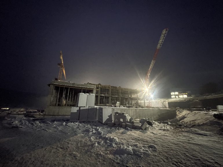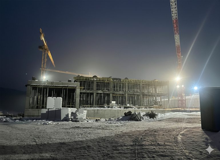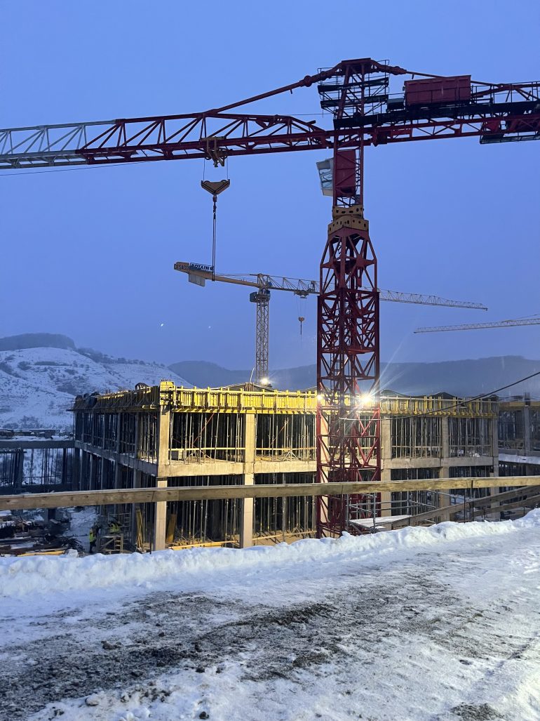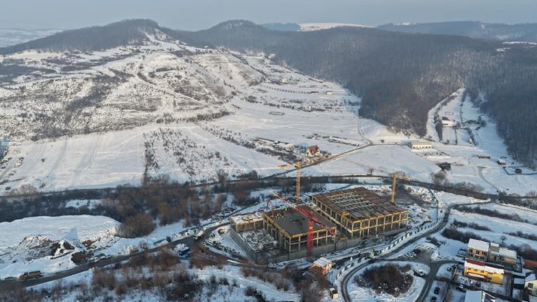 The Transylvanian winter tests both materials and team. Snow blankets the meadow, yet work continues under crisp blue skies. Cranes pivot against forested ridges while workers in high-visibility gear navigate scaffolding wrapped in protective sheeting. These images capture something essential: a building forged alongside the seasons, not despite them. Furthermore, rainwater now runs off freshly sealed surfaces into the on-site retention basin. This marks the first rehearsal of sustainability measures built into the design.