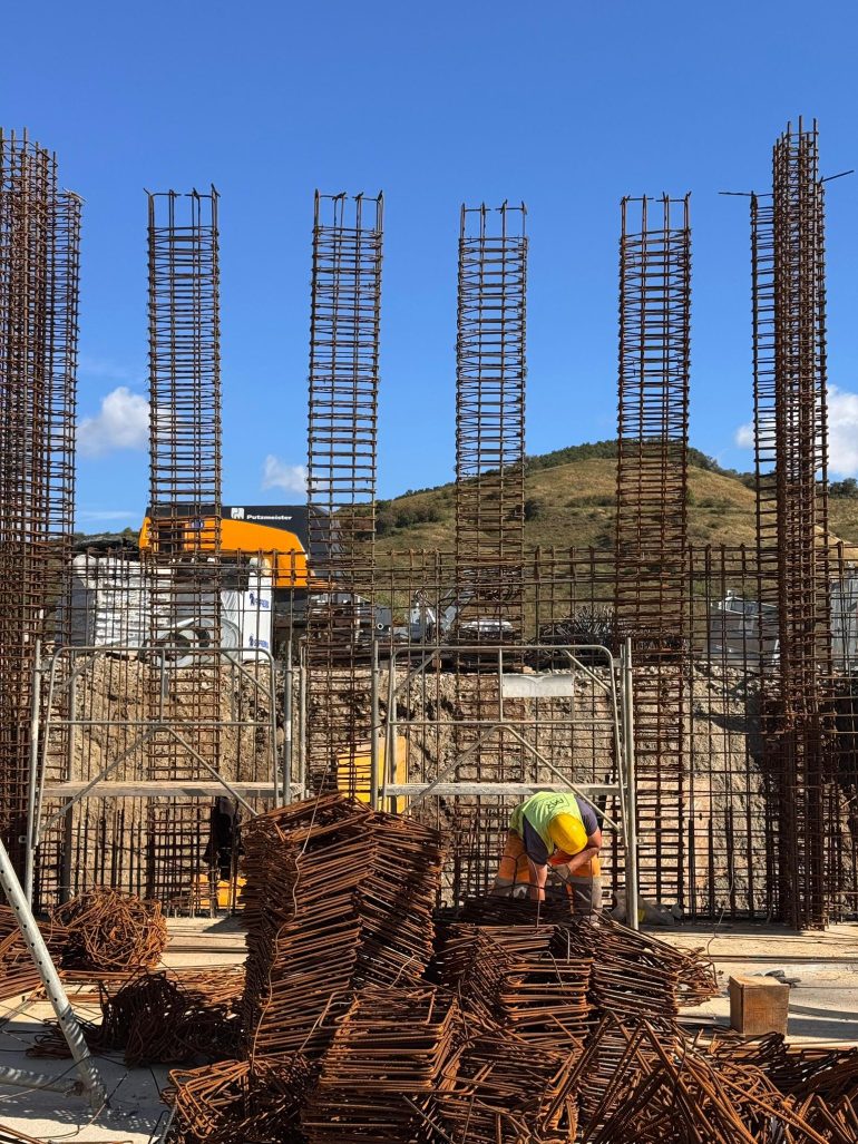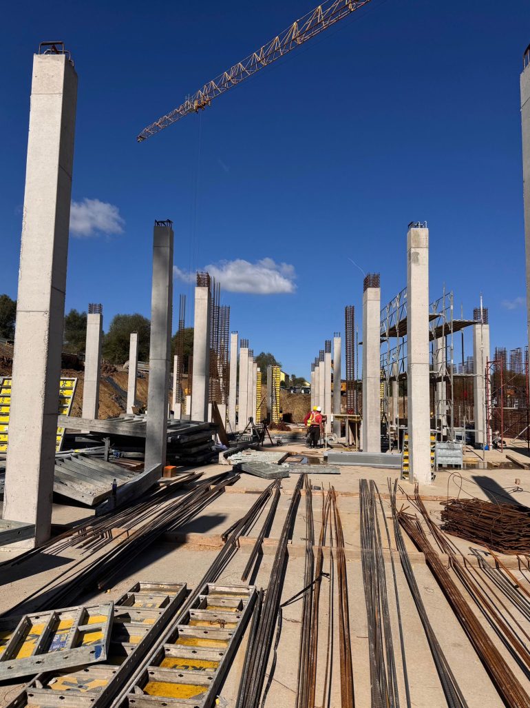 Construction began with a bold act of trust in the land. First, the construction team from our partner FAR FOUNDATION drove deep pile foundations into the site’s clay geology. Then, a carefully engineered raft system anchored the complex to the hillside. Today, the BIM-optimised concrete frame stands proud against the valley backdrop. Two monolithic volumes emerge exactly as envisioned. Their warm-hued bones await the pigmented skin that will mirror the region’s iron-rich soils.