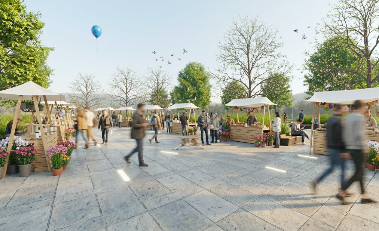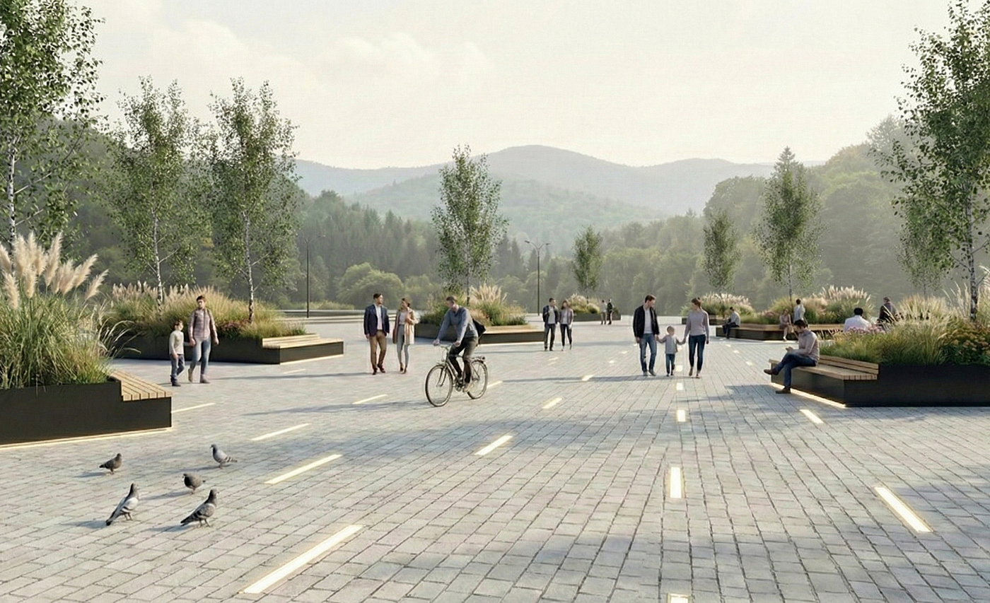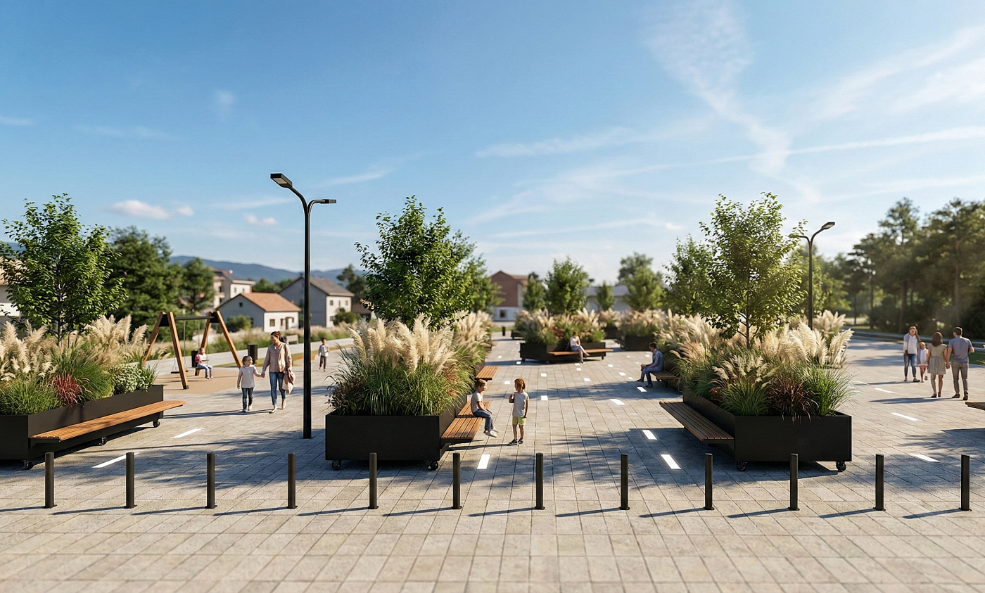 The architectural solution focuses on high-quality materiality and environmental resilience. The existing asphalt is replaced with a high-performance composite concrete pavement that ensures durability and a uniform aesthetic across the square. Due to the sensitive archaeological nature of the site, all structural interventions are limited to a maximum depth of 30 cm.