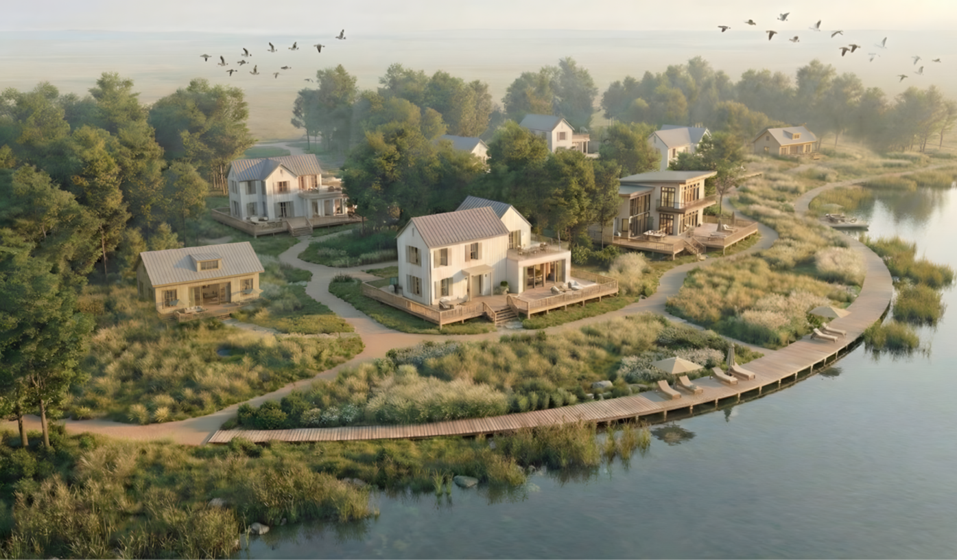 The built environment features a diverse range of accommodations, including modular bungalows and custom vacation homes that strictly adhere to NZEB (Nearly Zero-Energy Building) standards. These light structures are elevated on pillars to ensure a minimal ground footprint and are constructed using sustainable elements like CLT (Cross Laminated Timber) and natural wood finishes. To guarantee visual continuity with the forested slopes and the water, the architecture employs a carefully curated color palette featuring shades of light grey-green-beige, alabaster, clary sage, and ripe olive. The nautical infrastructure is equally unintrusive, utilizing modular floating pontoons with eco-friendly anchoring to support a non-motorized Kayak-SUP hub.